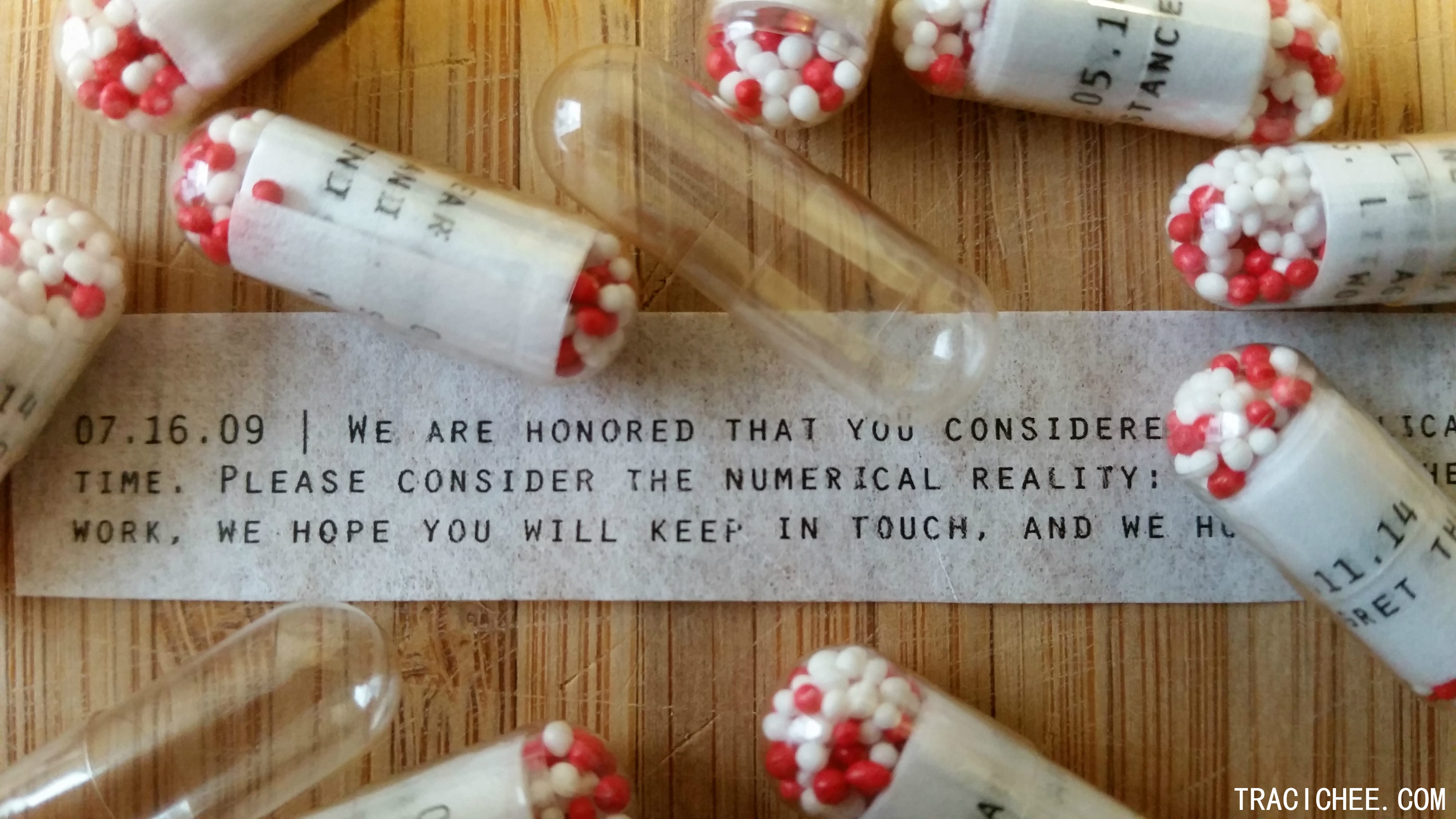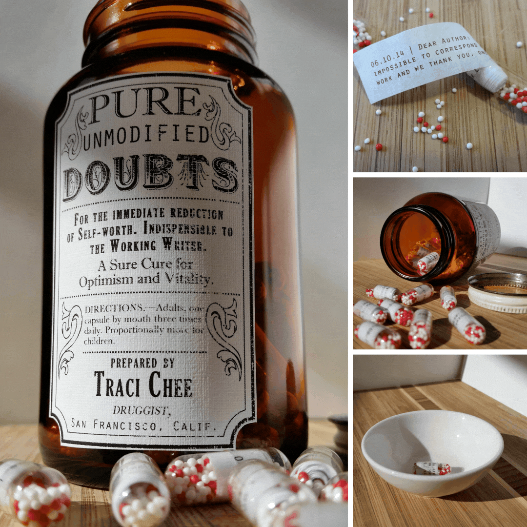 DOUBTS is a compendium of 50 rejections collected from 2006-2014, and as far as books go, it’s a little on the unconventional side. The binding is a vintage pill bottle with a rusty metal cap. The cover is a label, complete with dosage directions. Each page is an edible capsule containing one rejection—verbatim, with the date of receipt. The story is one of epistolary and memoir, pain and transformation. And also one of hope.