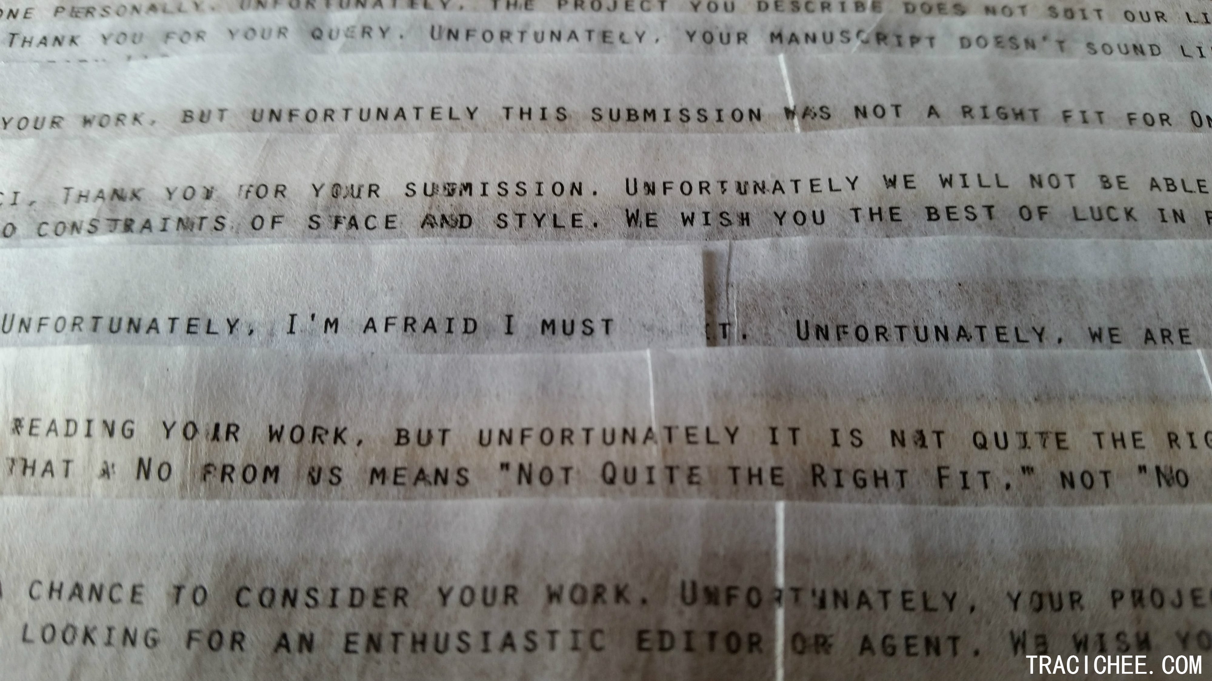 The rejections trickled in. Never fast enough to satisfy me. Never with enough information to help. I was riddled with uncertainty. Should I revise my query? My first ten pages? My whole manuscript? Should I trunk the idea entirely? Was I failure of the most gigantic proportions, completely oblivious to how awful my writing really was?